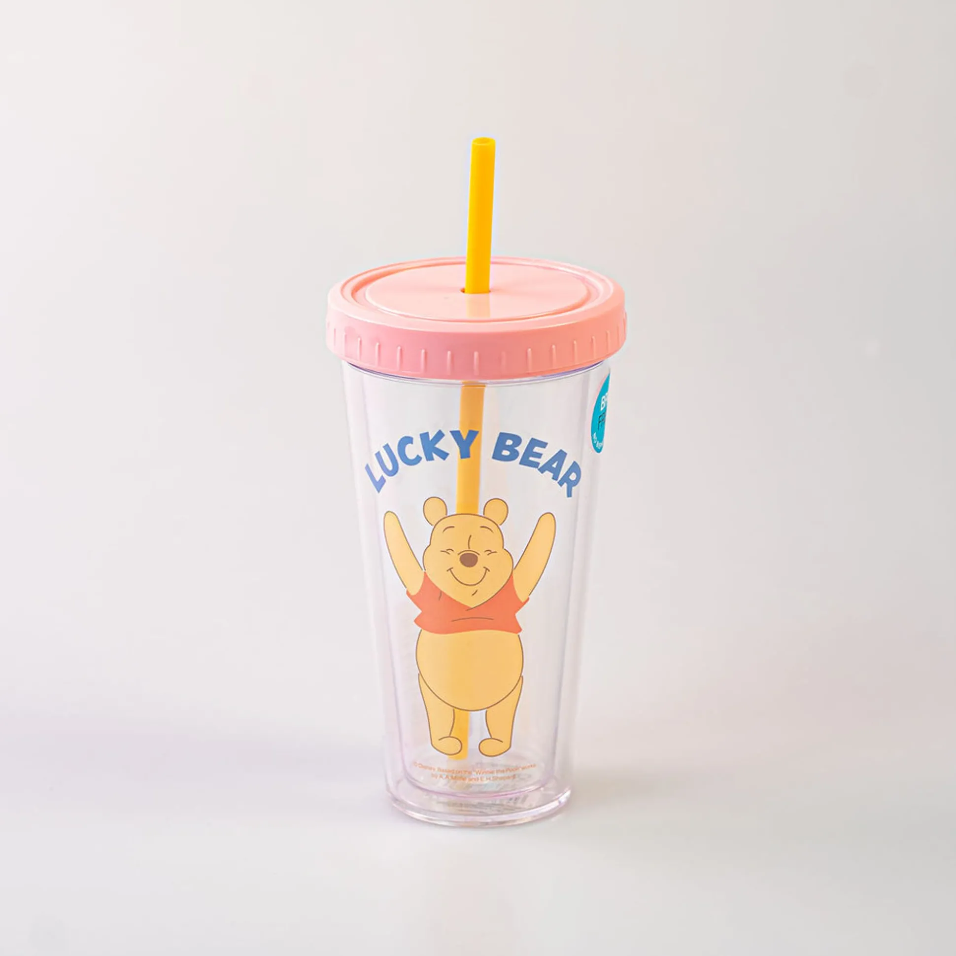 Borraccia Rosa Con Cannuccia Gialla Di Winnie The Pooh Della Collezione Disney Con La Scritta Lucky Bear.