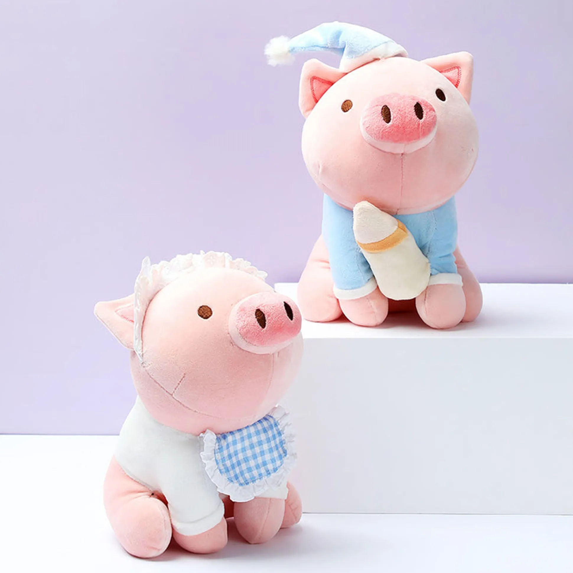 Peluche Maialino Bibi Con Pigiamino Bianco, Bavetta Azzurra A Quadretti E Cuffietta Bianca.