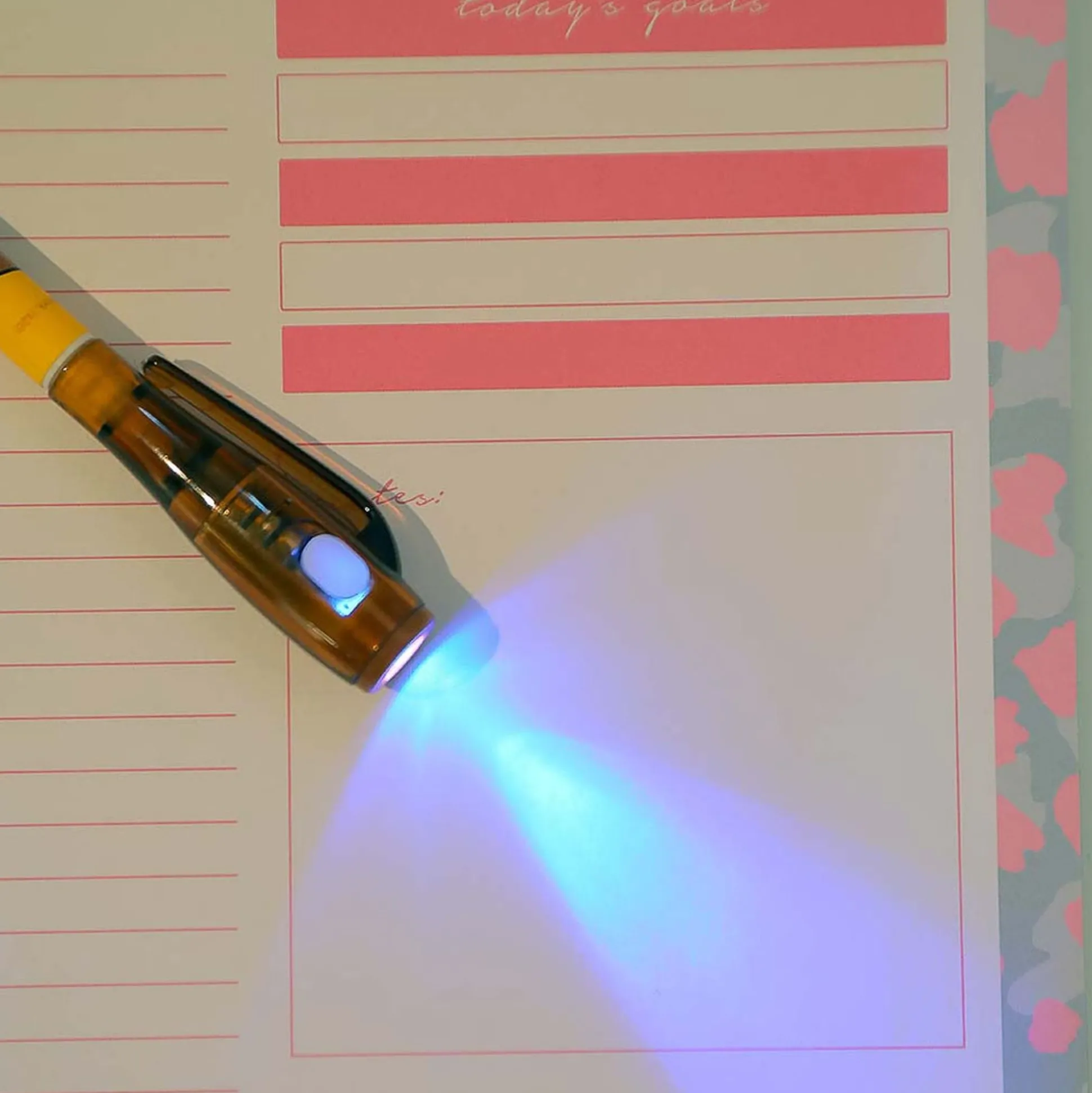 La Penna È Multifunzionale: Un’Estremità È Riempita Con Inchiostro Particolare Che Necessita Di Luce Uv Per Essere Visibile, L’Altra Estremità È Una Penna Normale.
