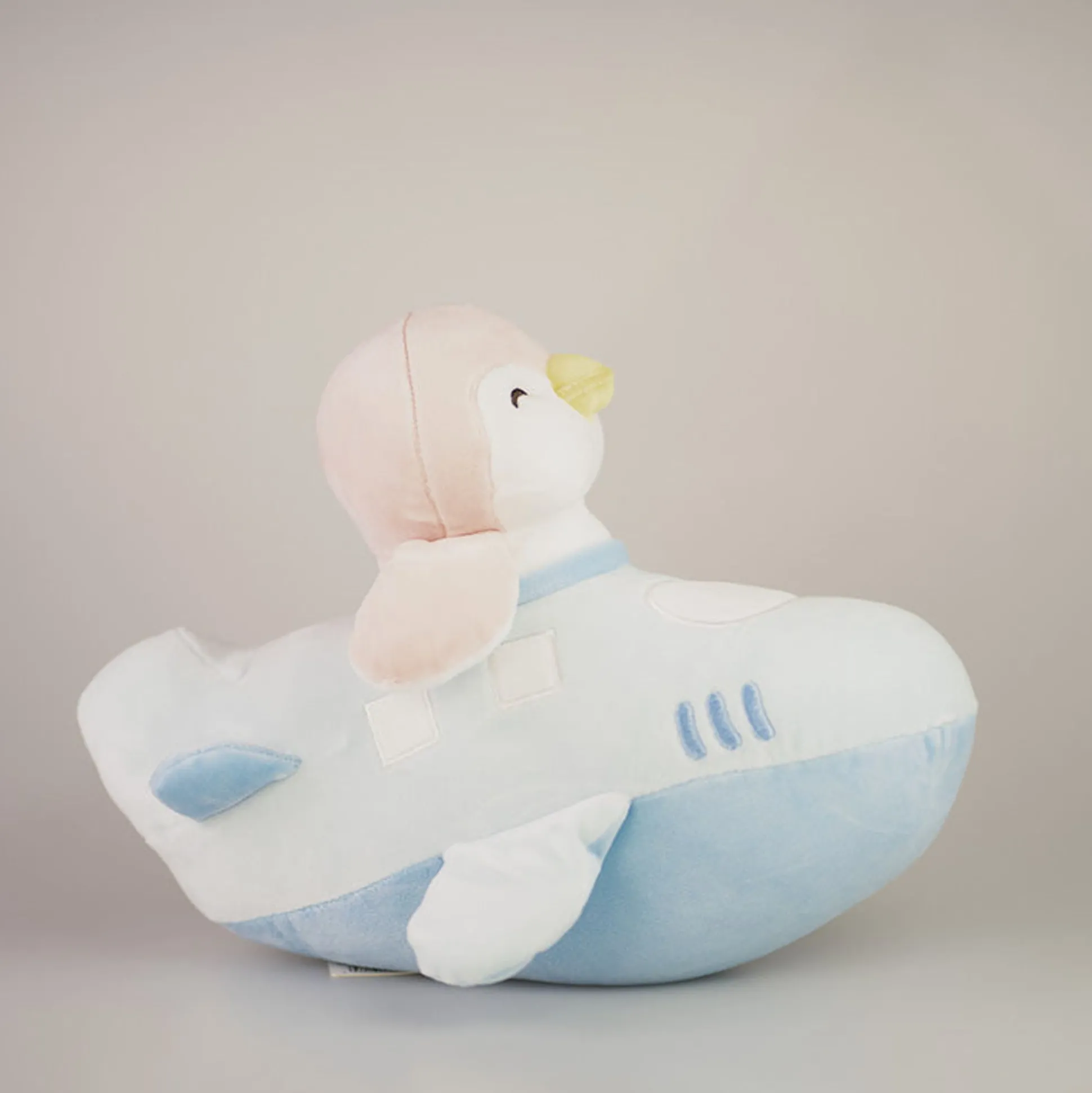 Morbido E Carino Peluche Di Penpen Rosa Su Aeroplano Azzurro.